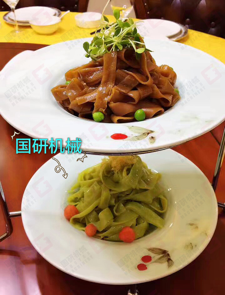 國研牌東北大拉皮機(粉皮機)采用自動下漿、蒸汽蒸熟,自動淋水分離 ,自動切條、切片(根據客戶的需要訂制)。生產過程可不需要專人操作,自動化生產。生產的拉皮晶瑩剔透,韌性強,口感好,生產效率高。每公斤淀粉可生產拉皮4.5-5.5公斤,該系列產品有多個規格,適合不同投資規模的客戶需求,辦食品加工廠,餐飲連鎖店,單位或學校食堂適用。