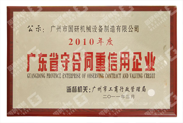 2011年4月,繼連續(xù)三年被評為“廣州市守合同重信用企業(yè)”之后,國研機械再獲殊榮,被評為2010年度“廣東省守合同重信用企業(yè)”。